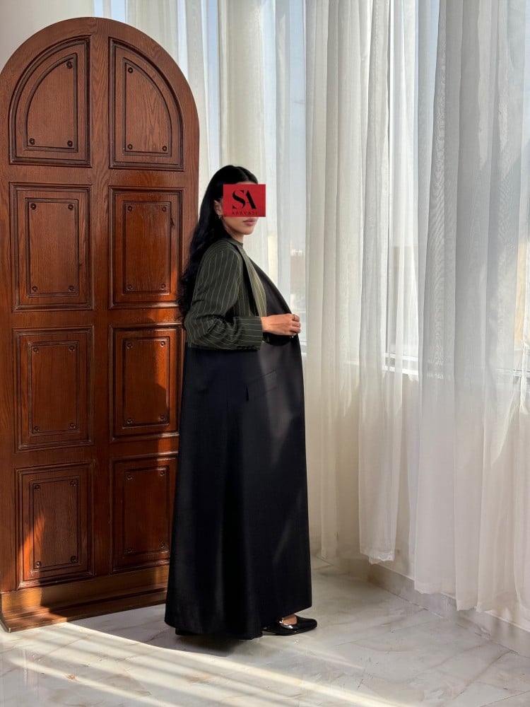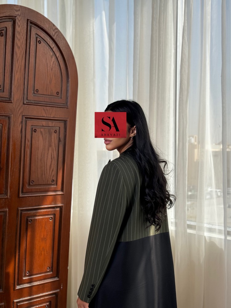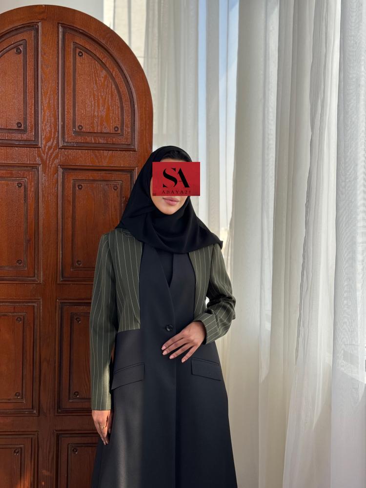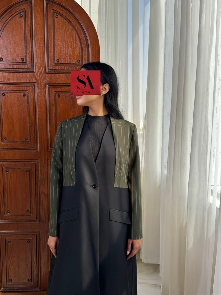 بليزر اسود كتان هندي مع قطعه ثابته زيتي مخطط كريب