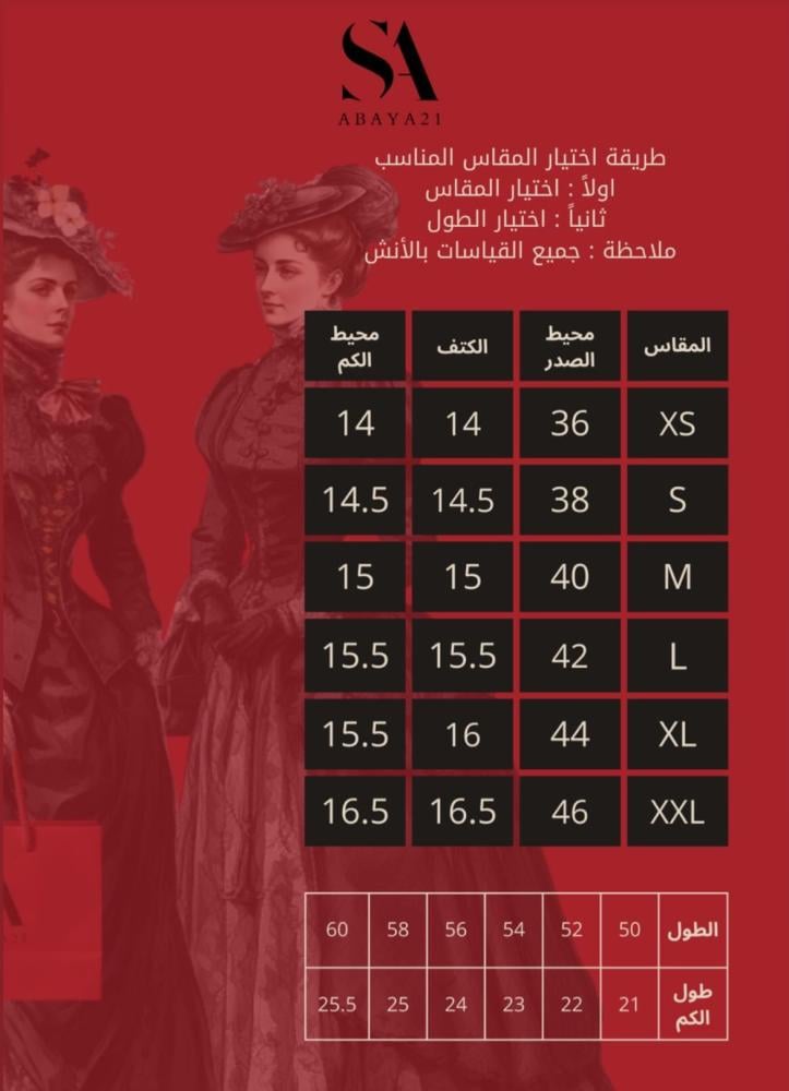 - الرجاء اختيار المقاس المناسب من الجدول المرفق (مسؤولية العميلة).