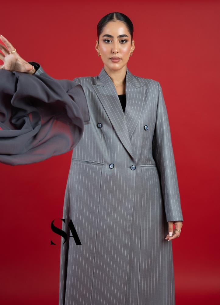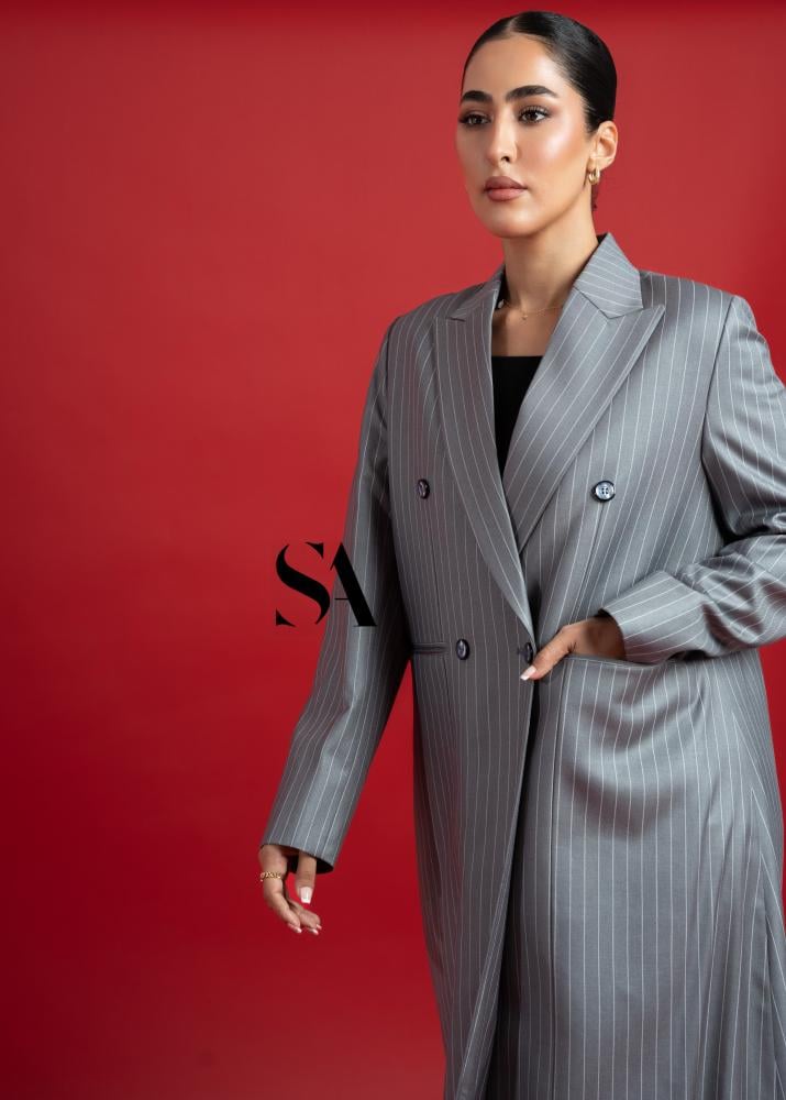 بليزر شتوي كلاسيك باللون الرمادي مخطط باللون الابيض بالاظافة الى طرحة ساده ..