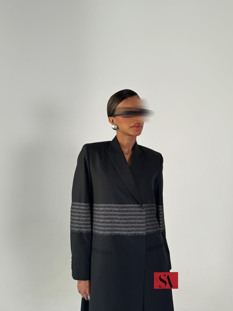 القماش المستخدم كتان صيفي مع تداخلات باللون الرمادي مبطن بالكامل من الداخل ويحتوي ايضاً على اسفنج اكتاف مخفي لاطلاله انيقه ومميزه ..✨