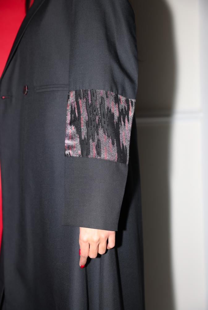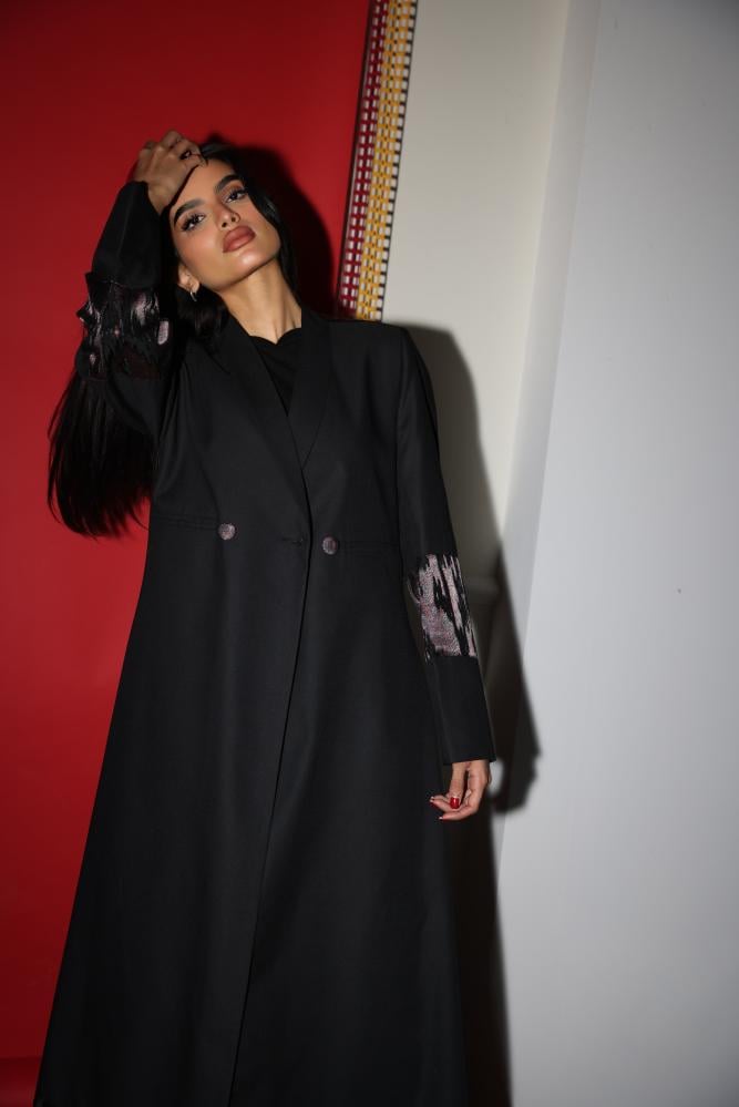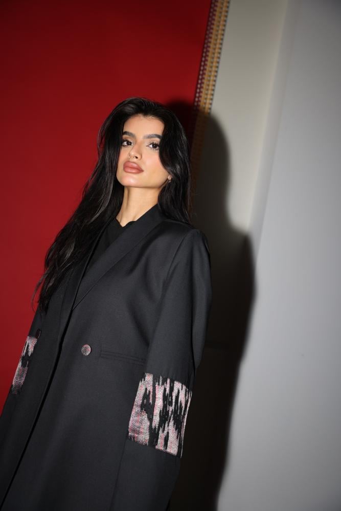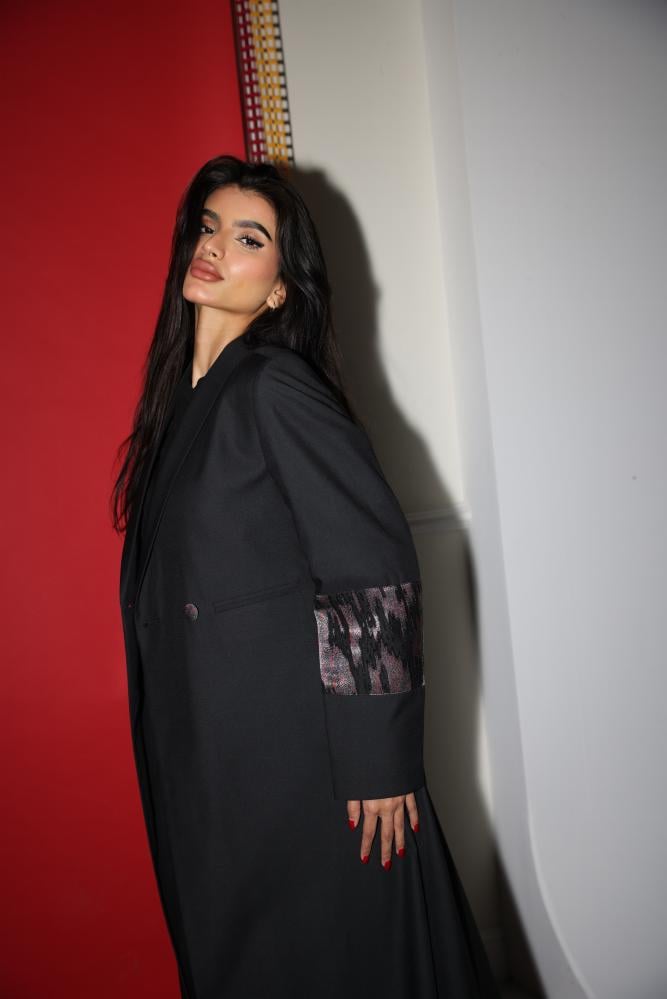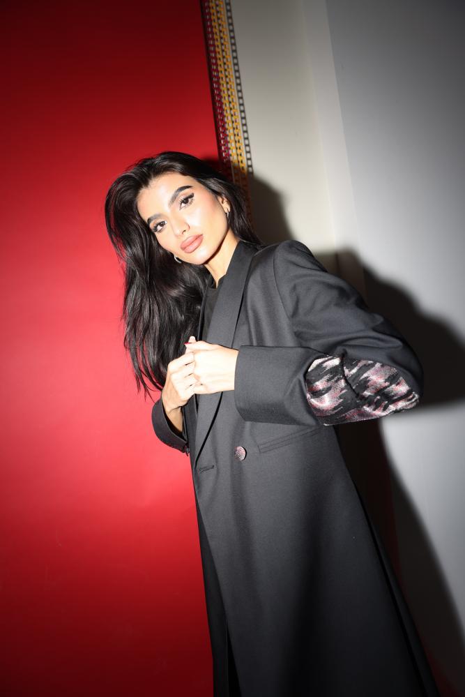 وارتدي بليزر باللون الاسود كتان مع تداخلات شيفون