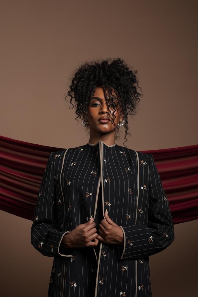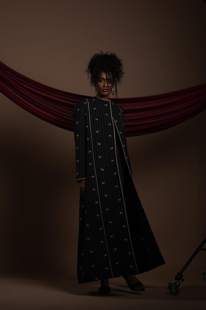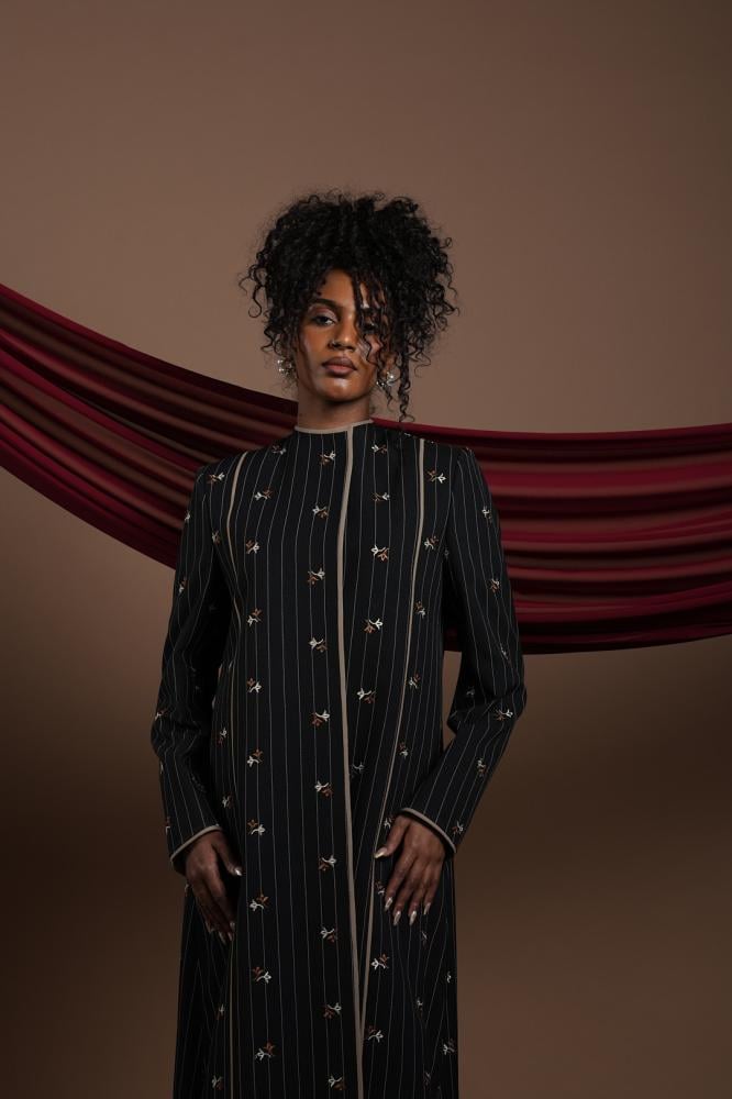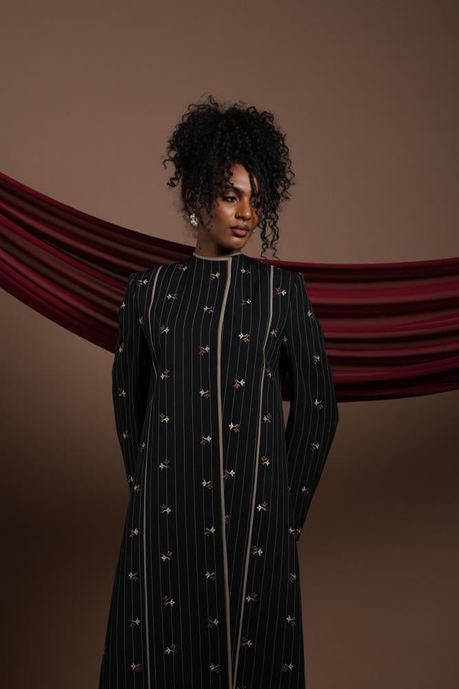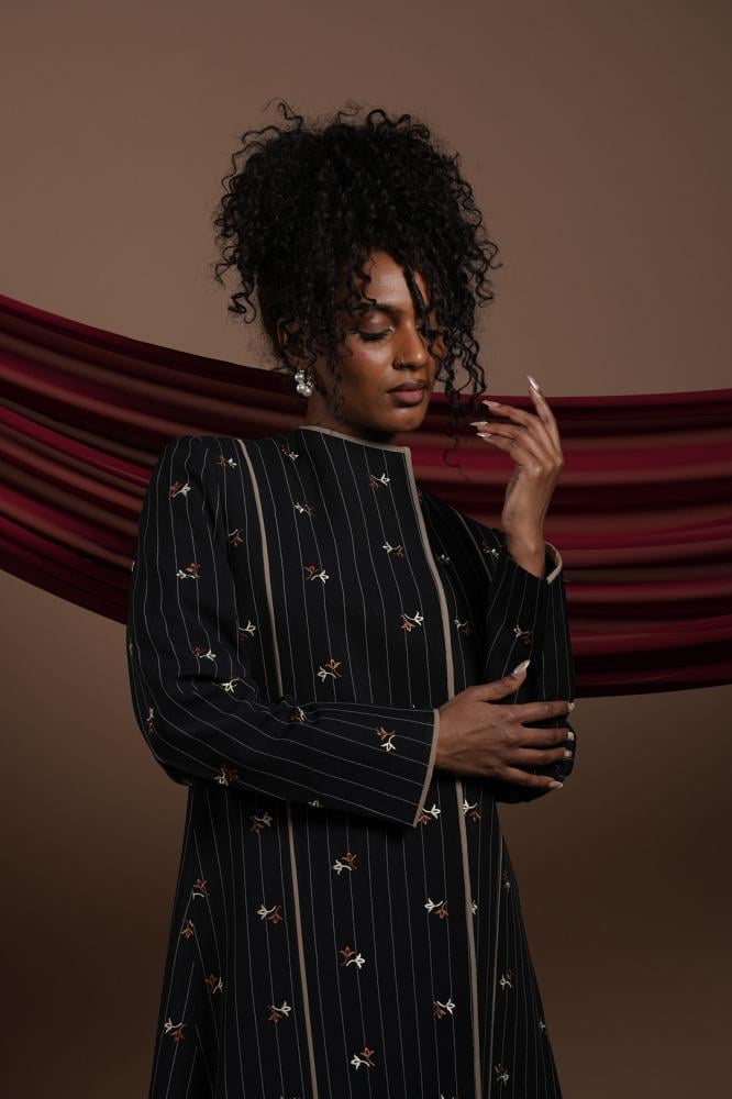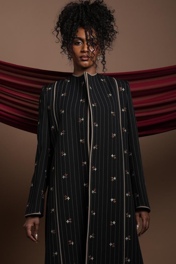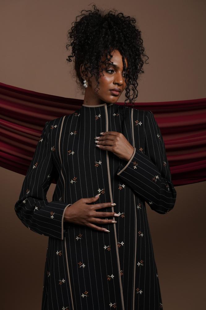 تم اختيار الكريب التايواني الاسود المخطط لتصميم هذه القطعه الراقيه