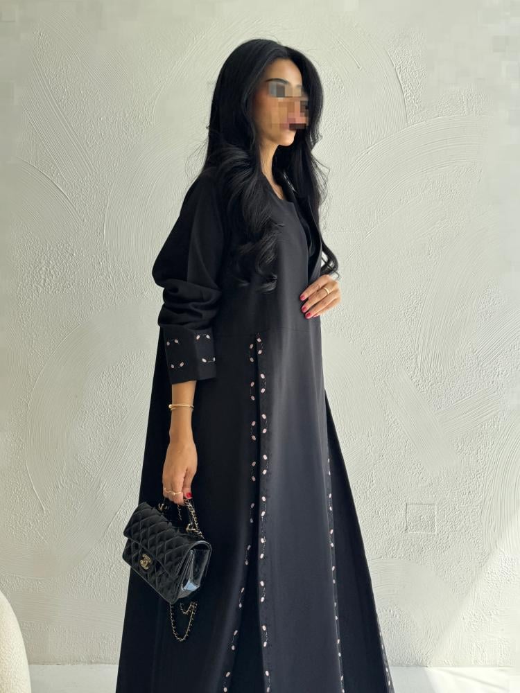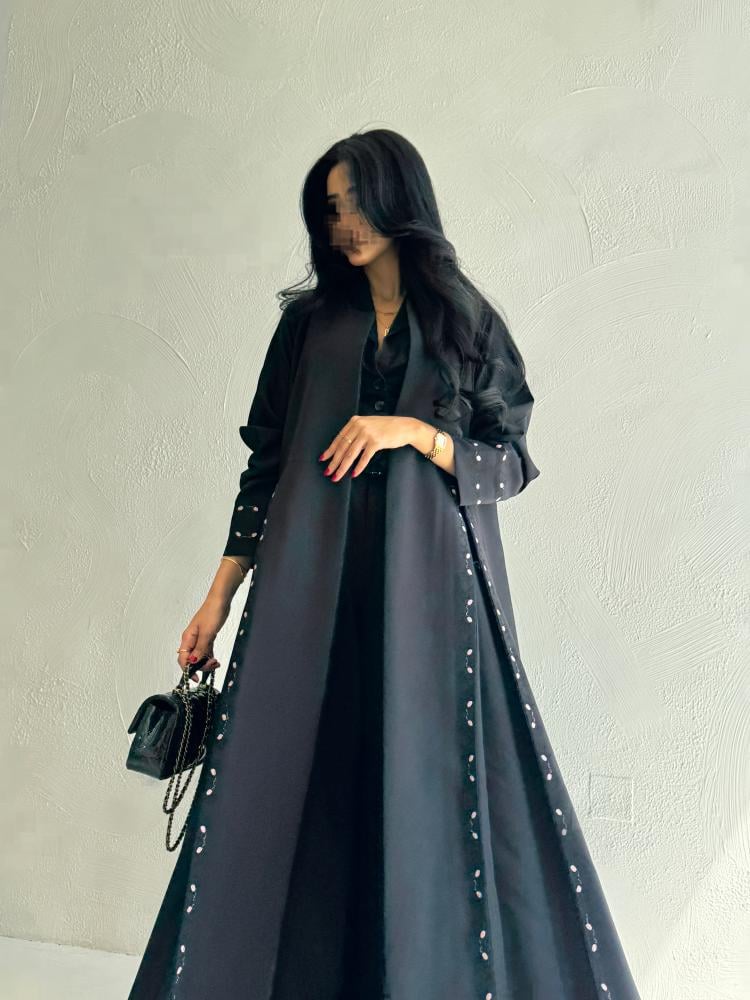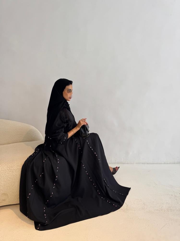 تميّزي بإطلالة تنبض بالفخامة والأنوثة مع هذه العباية المصنوعة من قماش الكريب الأسود الفاخر، بتفصيل نصف كلوش ينسدل بأناقة، ويزيده جمالًا وجود كسرات ناعمة تضيف لمسة من الانسيابية والحركة.